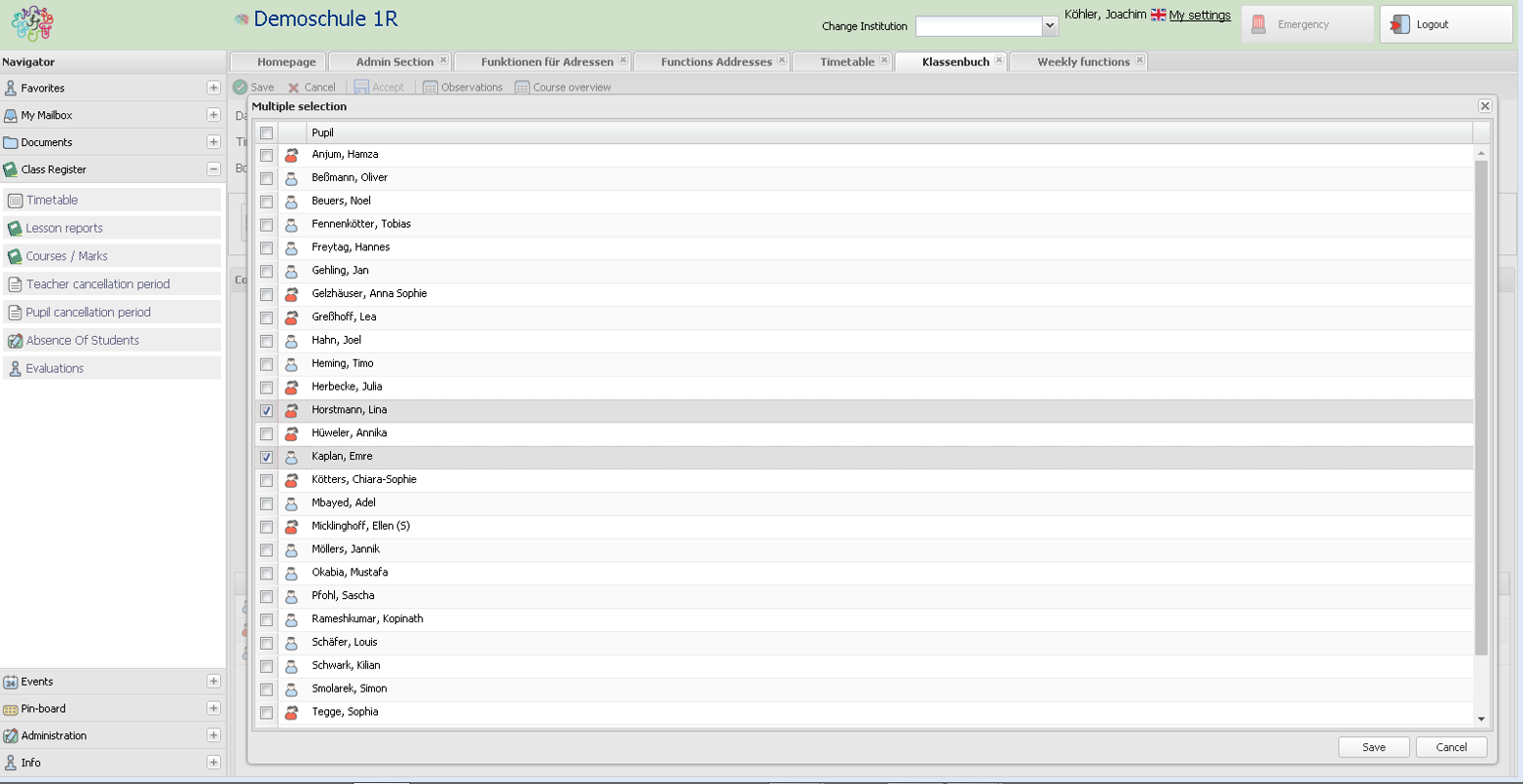 Die Sichtbarkeit der einzelnen Registerkarten ist konfigurierbar. So können z.B. an Ganztagsschulen Hausaufgaben ausgeblendet werden.